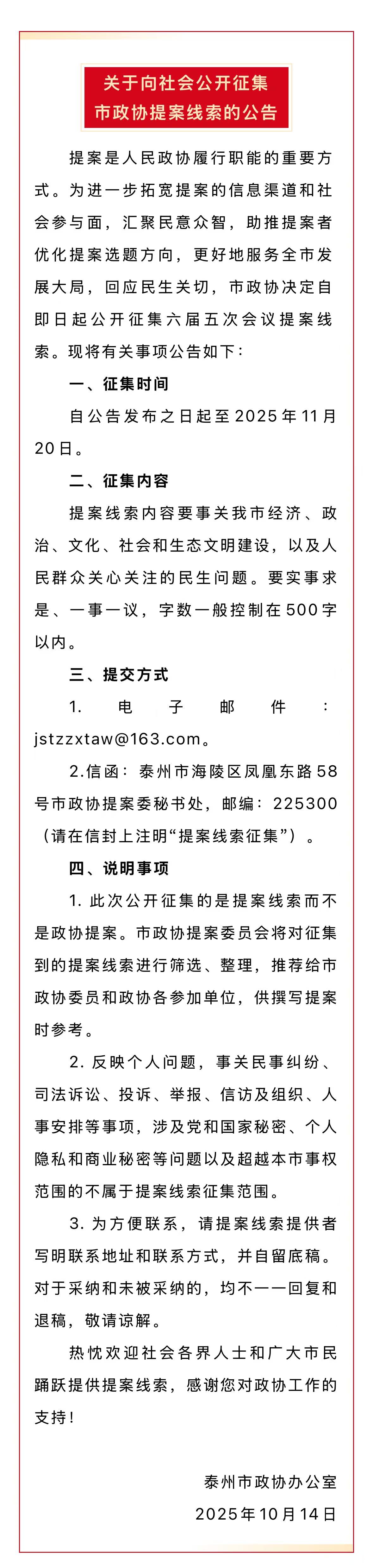泰州市政协公开征集提案线索